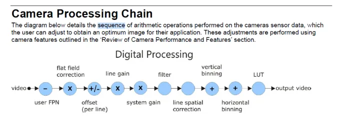 EnhancementofInterest (EOIs) Regions Reduce ImageData&EnhancePerformance See the section Flat Field Category in Appendix A for GenICam features associated with this section and how to use them Related Features: enhancedImage, enhancedImageCount, enhancedImageSelector, enhancedImageStart, enhancedImageWidth, enhancedImageOffset and enhancedImageGain Enhancement of Interest (EOI) regions allow rapid gain and offset settings to be applied to up to 4 regions in the image. EOIs are supported in all imaging modes except for Super Resolution mode. The EOI feature has been optimized to load in minimum time (~ 50 ms) by only applying a gain and offset on a region rather than per-pixel. DN 255 Pixel Value EOI Start X Coordinate EOI Width 0 ImagePixel XCoordinate Figure 44: Enhancement of Interest EOI Offset &Gain Adjustment EOIs are designed for applications where maximum line rate is a priority and pixel flatness for the region is tolerable, as compared to HDR mode or regional flat field correction (FFC), which provide per pixel adjustments. For example, if image has regions that are highly reflective and other regions that are dark, the response in a region can be adjusted to flatten the output. HDR mode or regional FFC can compensate for this by applying a per-pixel based correction, providing the best result for a flat image. However, HDR limits the maximum line rate due to dual line acquisition and FFC requires greater than 2 seconds to load user set coefficients and cannot be used to adjust to changes in image regions in real-time. Alternatively, EOIs provide the maximum line rate but with a flattened image region.